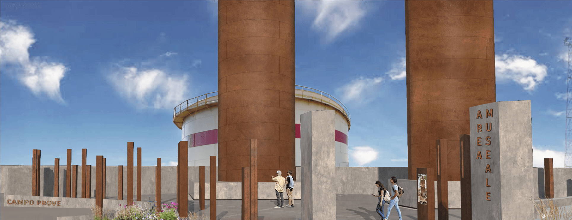 Spazi aperti curati, percorsi accessibili e nuove aree per l’accoglienza costruiscono un luogo che invita alla scoperta. L’acciaio corten, il calcestruzzo e gli allestimenti didattici contribuiscono a definire un’identità forte e accogliente, capace di restituire dignità a un’area rimasta in silenzio per anni.