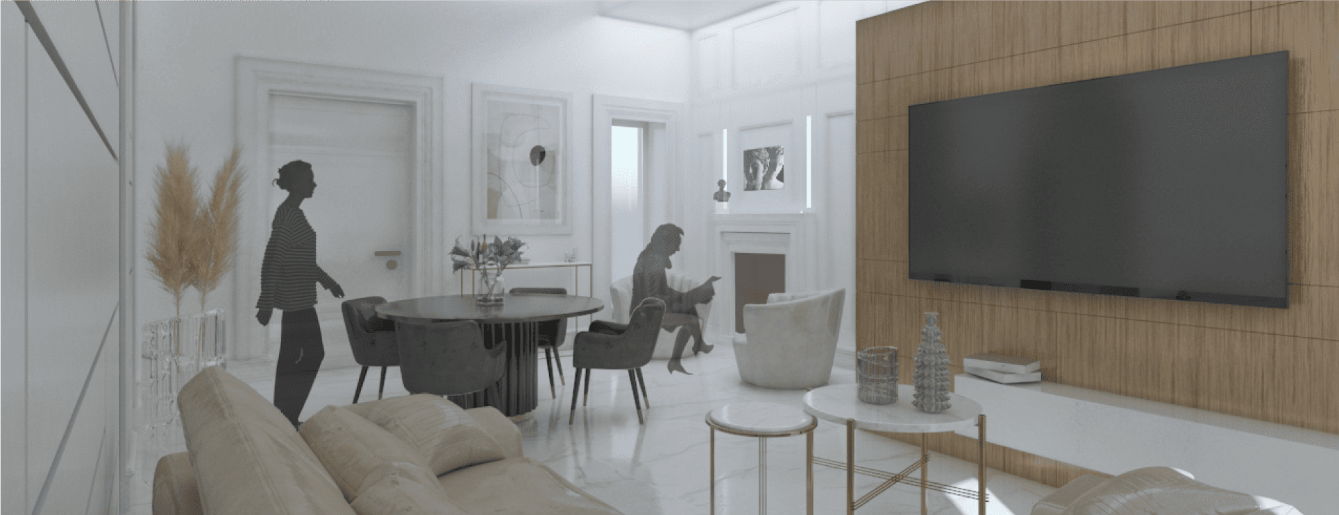 La principale sfida progettuale è stata l’assenza di luce naturale nella zona living. Per questo motivo, abbiamo scelto colori chiari, superfici riflettenti ed effetti marmo in bianco Calacatta per amplificare la luce e restituire profondità allo spazio.